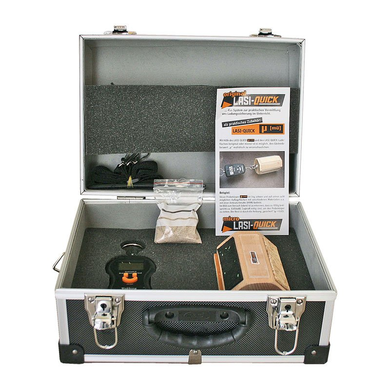Schulungskoffer zur realistischen Demonstration des Gleitreibewertes "µ" mittels Hängewaage und Probekörper mit acht unterschiedlichen Flächen. Am praktischen Beispiel lässt sich die Bedeutung des Einsatzes von Anti-Rutschmatten (ARM) eindrucksvoll belegen. Die digitale Hängewaage zeigt den ermitteln µ-Wert jeweils präzise an.