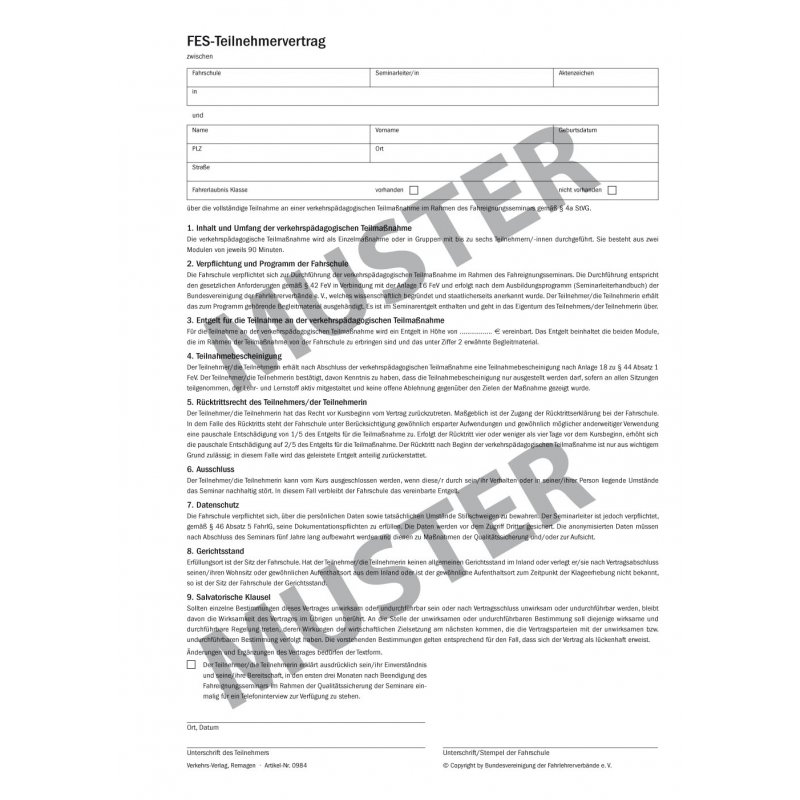 Der "FES-Teilnehmervertrag" ist ein Formularsatz im DIN A4 Format, gedruckt auf hochwertigem SD-Papier, der eine effiziente und klare vertragliche Regelung zwischen Fahrschulen bzw. Bildungseinrichtungen und Teilnehmern an Fahrerlaubniserweiterungsseminaren (FES) ermöglicht. Jeder Pack enthält 6 Durchschreibesätze, die eine einfache Handhabung und sofortige Dokumentation von Original und Kopie ermöglichen. Dieser Vertrag ist essenziell für die rechtssichere Dokumentation und Verwaltung der Teilnehmerverhältnisse in Programmen zur Verkehrserziehung und Fahrerlaubniserweiterung.