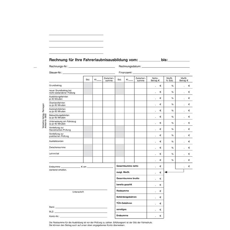Unsere Ausbildungs-Rechnungen für Fahrschulen im DIN A4 Format bieten eine praktische Lösung für die finanzielle Verwaltung und Dokumentation. Diese Rechnungen auf SD-Papier ermöglichen eine unkomplizierte Durchschrift des Originals, wodurch sowohl die Fahrschule als auch der Fahrschüler sofort eine Kopie erhalten. Jeder Pack enthält 25 Sätze, die speziell darauf ausgelegt sind, die Abrechnungsprozesse von Fahrschulen zu vereinfachen und zu beschleunigen. Diese Formulare sind ideal für Fahrschulen, die eine effektive und professionelle Abwicklung ihrer Buchhaltungs- und Abrechnungsaufgaben anstreben.