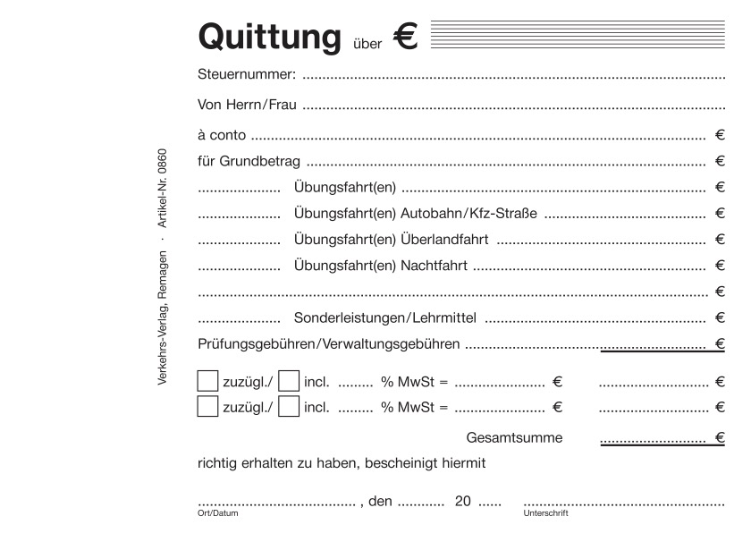 Unsere Quittungen für Fahrschulen im DIN A6 Format bieten eine praktische Lösung für die finanzielle Verwaltung und Dokumentation. Diese Quittungen auf SD-Papier ermöglichen eine unkomplizierte Durchschrift des Originals, wodurch sowohl die Fahrschule als auch der Fahrschüler sofort eine Kopie erhalten. Jeder Block enthält 50 Blatt, die speziell darauf ausgelegt sind, die Abrechnungsprozesse von Fahrschulen zu vereinfachen und zu beschleunigen. Diese Quittungen sind ideal für Fahrschulen, die eine effektive und professionelle Abwicklung ihrer Buchhaltungs- und Abrechnungsaufgaben anstreben.
