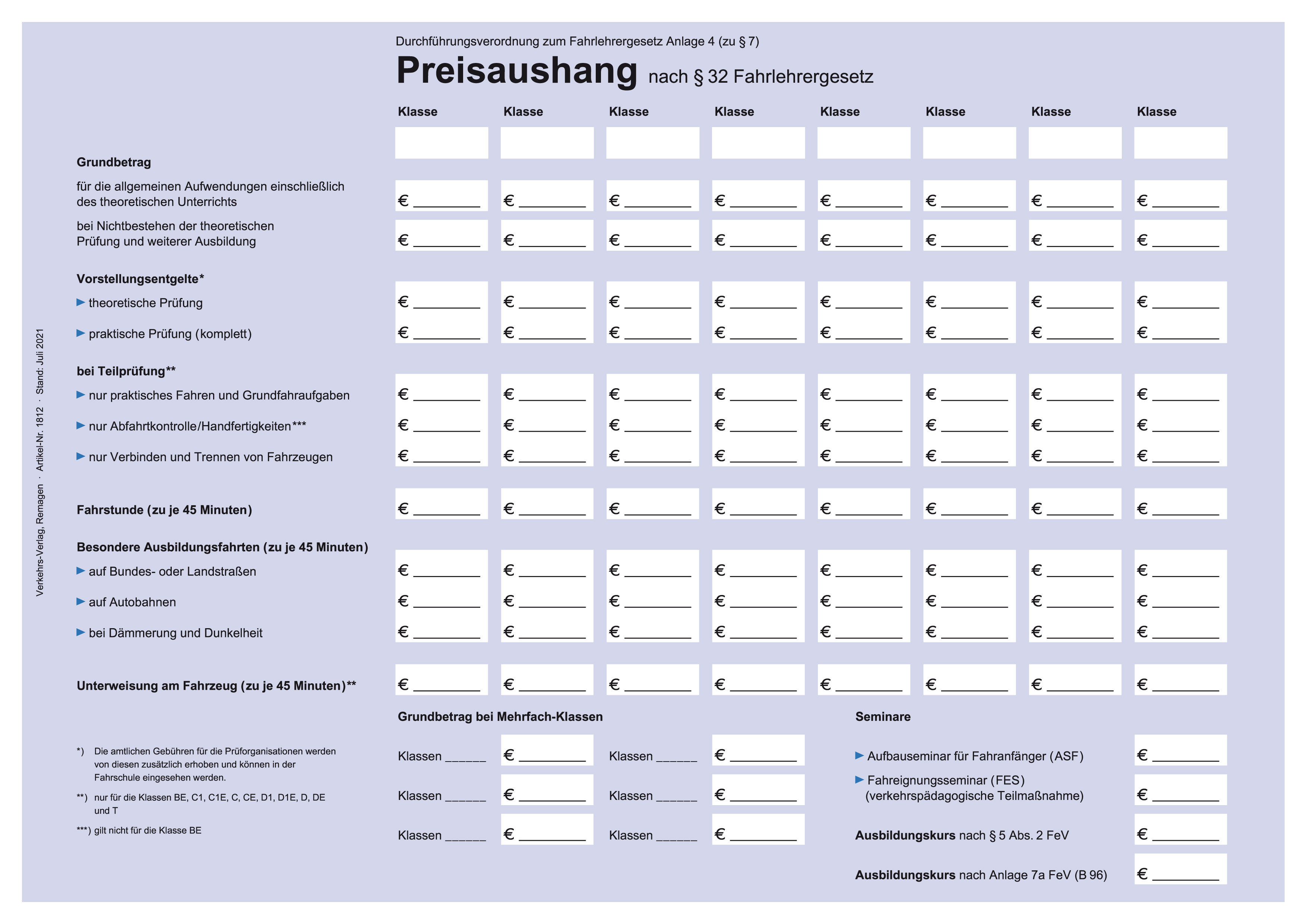 Unser Preisaushang im DIN A4 Format ist speziell für Fahrschulen entwickelt worden, um die Preise für verschiedene Kurse und Dienstleistungen transparent und zugänglich zu präsentieren. Die Tafel ist einlaminiert und gelocht, sodass sie einfach in jeder Infotafel angebracht werden kann und gegen Abnutzung und Umwelteinflüsse geschützt ist. Dies ermöglicht es Fahrschulen, ihre Tarife klar und professionell zu kommunizieren und gleichzeitig sicherzustellen, dass die Informationen jederzeit für Fahrschüler und Besucher sichtbar sind. Ideal für die verantwortungsvolle und offene Preisgestaltung in Ihrer Fahrschule. Artikel-Nr. 1801.