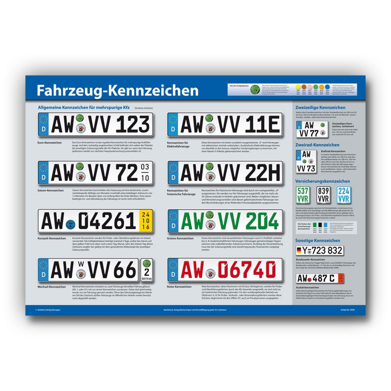 Unser Poster "Fahrzeug-Kennzeichen" im DIN A1 Format (84,1 x 59,4 cm) ist ideal für Fahrschulen. Es passt perfekt in Klapprahmen, Spannrahmen oder Kundenstopper und dient als effektive Werbung und Information zur Förderung Ihrer Fahrschüler.