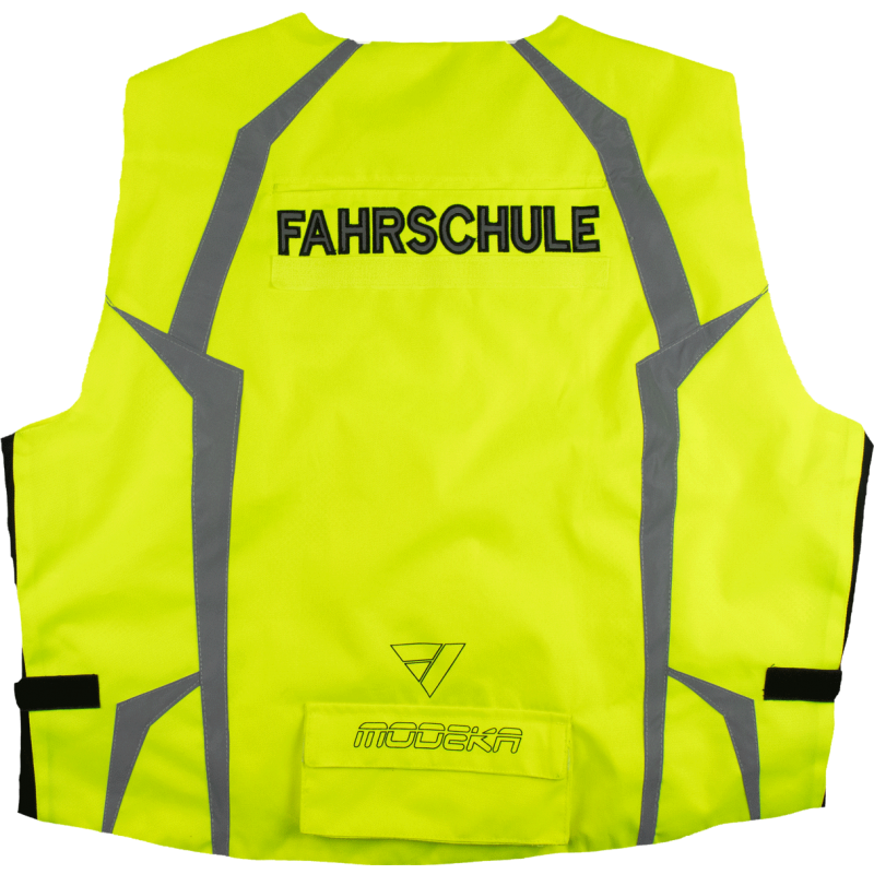 Der Schriftzug "FAHRSCHULE" auf der Weste ist aus einem hochwertigen, reflektierenden Stick gefertigt. Dieser Schriftzug erhöht die Sichtbarkeit und signalisiert anderen Verkehrsteilnehmern deutlich, dass es sich um ein Fahrschulfahrzeug handelt.